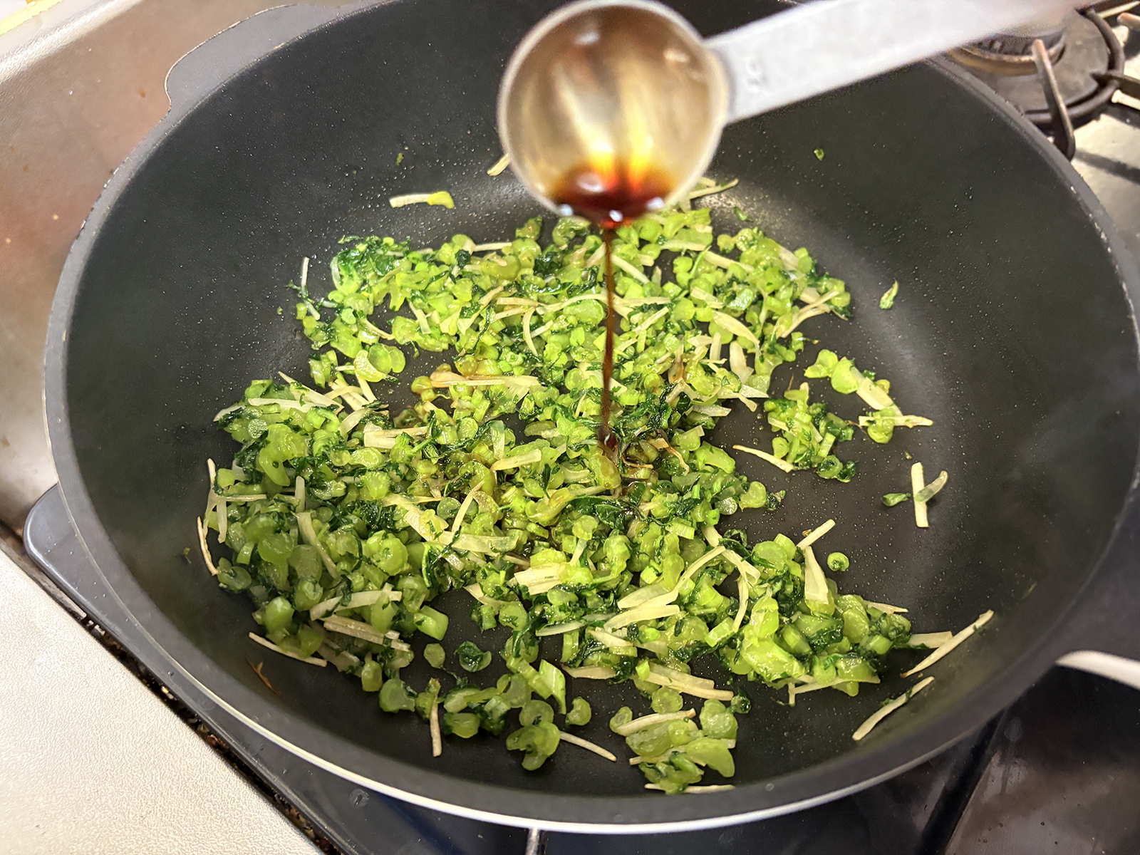 大根の葉と皮がしんなりしてきたら砂糖を加えます