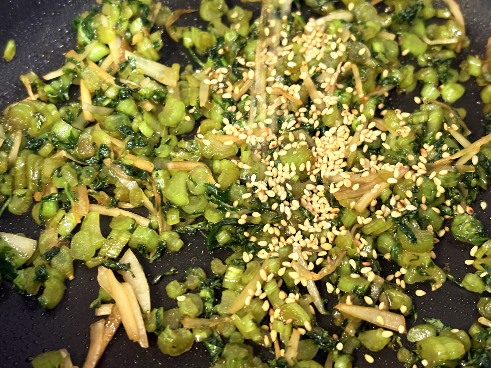 最後に白ごまをひとふりして、香ばしく仕上げます。