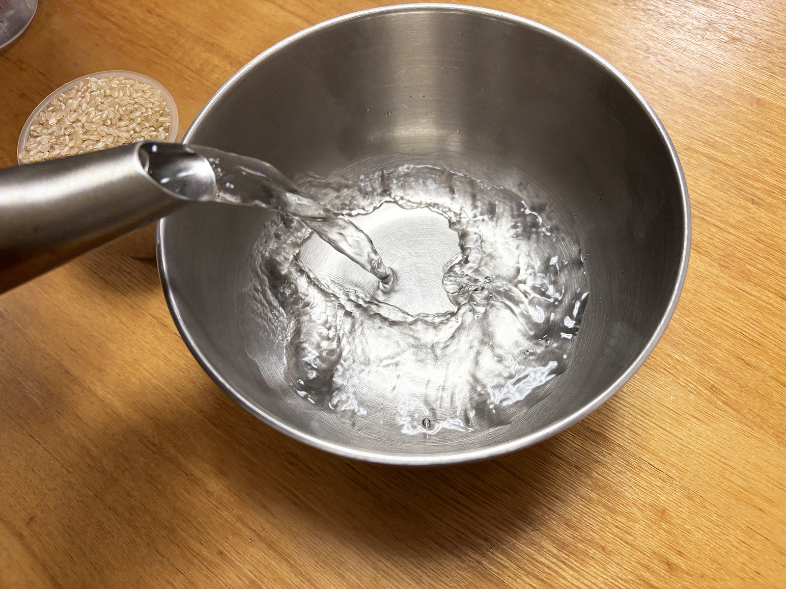 熱湯と水を同量合わせると約50度に、そこに玄米を入れます