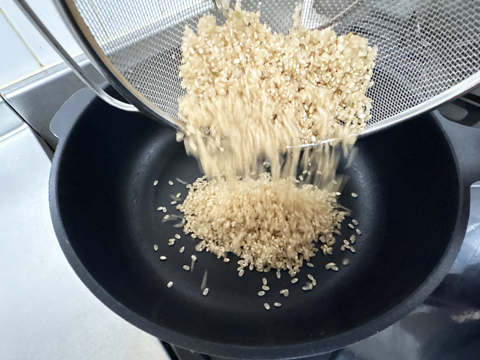 まず、玄米を50度のお湯で洗ってから、フライパンで炒るだけ。
